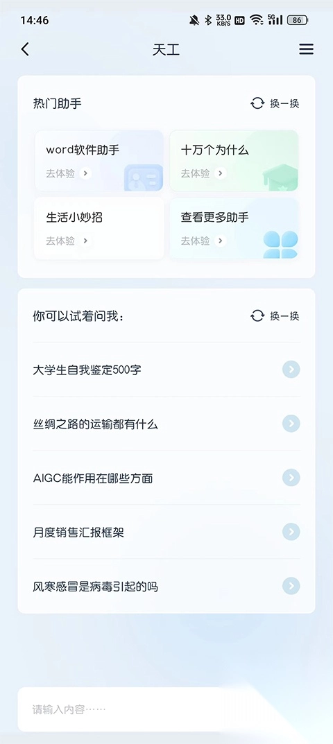 天工APP官方版是昆仑万维基于大语言模型打造的一款对话式AI产品。这款应用具备六大主要功能,分别为AI生成创作、科学技术知识问答、职场规划决策、多语言翻译、代码编写以及应用解析。凭借其强大的自然语言处理与智能交互能力,它能助力用户解决诸多职场难题。此外,该软件拥有丰富的知识储备,覆盖科学、技术、文化、艺术、历史等多个领域,还可用于学习辅助。