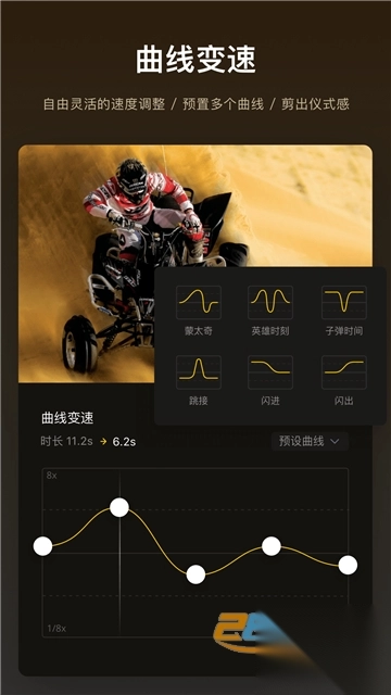【曲线变速】除了常规的变速外,VN 还支持曲线变速,轻松帮你实现视频快慢交替变化的特效,堪比 premiere 的时间重映射功能。此外 VN 提供 6 种预置曲线供大家参考。