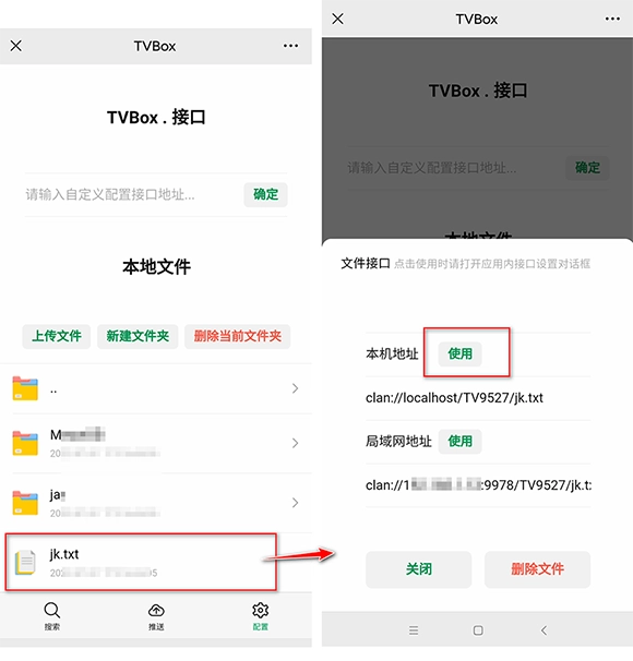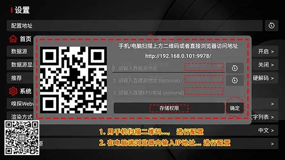 先点击“存储权限”获得,然后用手机扫描二维码后在手机界面上操作上传接口文件到TVBox端,再设置好接口地址(格式:clan://localhost/文件夹名/文件名)。