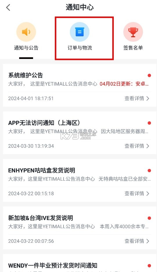 你也可以选择点击进入app首页,在首页中间位置找到“通知中心”并点击,接着点击“订单与物流”,以此来查看物流信息。