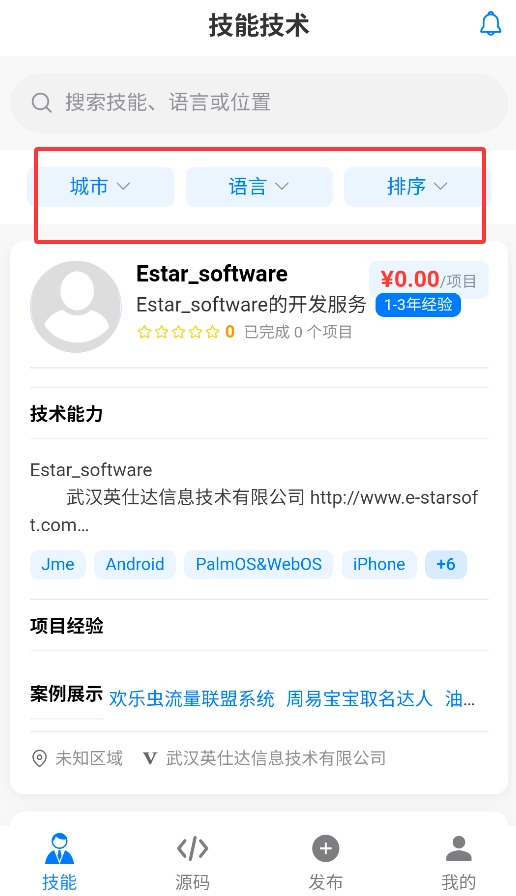 1. 打开APP后,于“技能市场”中挑选所在城市以及开发语言(例如Python/Java ),系统便会匹配本地的技术人才或者项目需求。