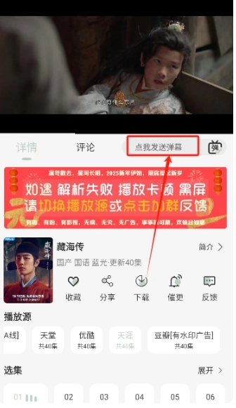 2、点击进入相应播放界面,在这里,我们不仅能看到收藏、分享、下载等一系列功能,还能选择播放源和集数。