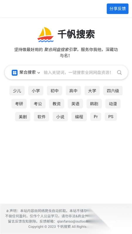 千帆搜索官方 2025 最新版本,是一款便捷实用的在线搜索工具。它能够凭借搜索手段,精准定位用户所需资源,还支持对多种网盘进行搜索。用户可依据自身需求,挑选恰当的资源。这款软件不存在搜索使用次数的限制,用户随时随地皆能展开搜索。简洁的 UI 设计,为用户带来更为优质的下载体验!