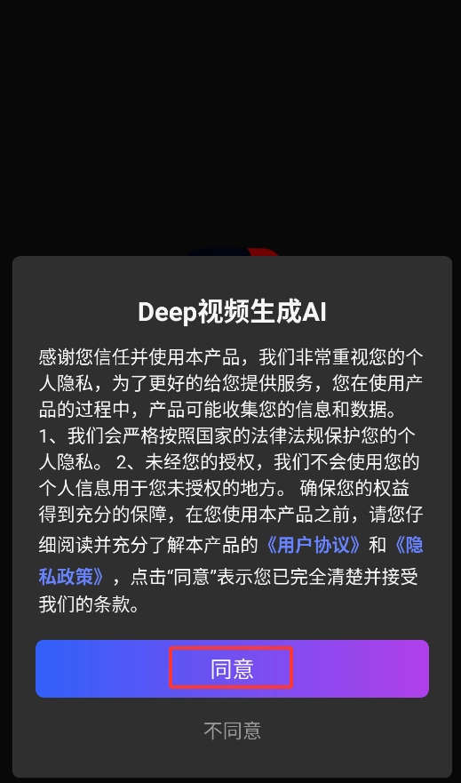 1. 当首次启动APP时,会弹出用户协议窗口,点击“同意”按钮,就能进入AI视频生成平台的主界面。