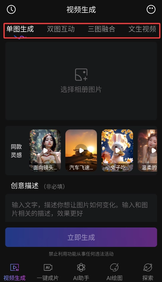 2、“智能生成”具备单图转视频、多图动态融合以及通过文字描述生成视频的功能(需输入200字以内的创意文案)。