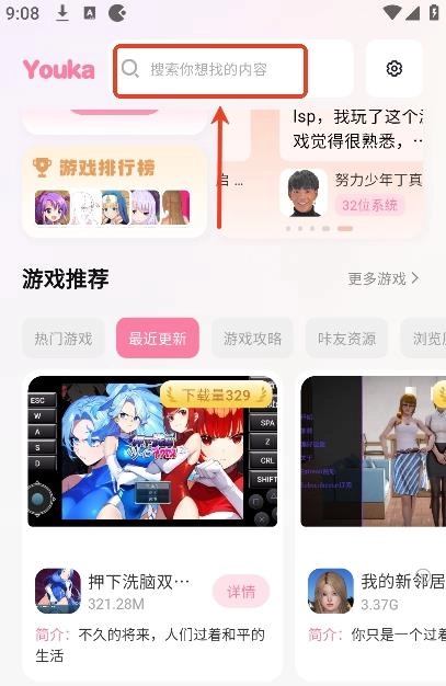 1、用户打开app后,能够在首页的搜索栏,搜索自己想找的游戏名称,或者相关的游戏攻略。
