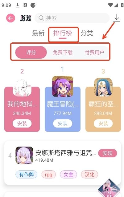2、用户能够依据游戏排行,挑选自己喜爱类型的游戏进行下载与安装。游戏排行包含评分榜、免费下载榜以及付费榜。