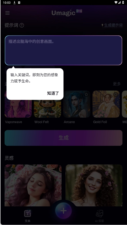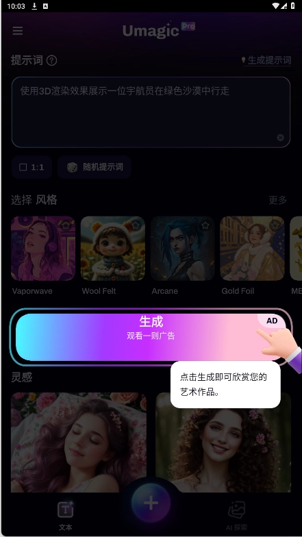 A:第一步,输入您的创意文本描述,或者上传图片作为创作基础。接下来,您可以从多种提供的艺术风格里挑选一种,要是不想选,也能直接采用默认设置。完成这些后,点击“生成”按钮,稍作等待,您的首个AI创作作品便会展示在您眼前。