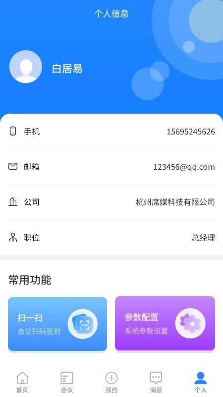5、在个人中心,就能个人信息,同时可进行会议扫码签到;