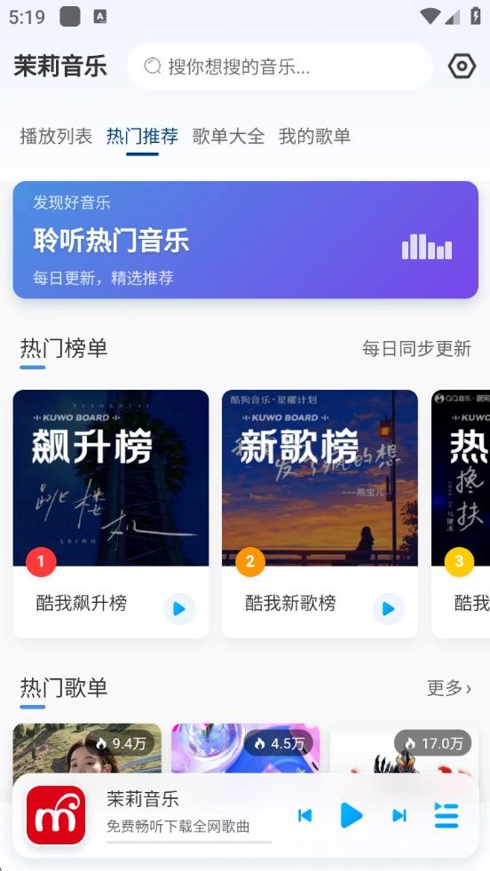 1、茉莉音乐app具备强大的网络音乐搜索功能,无论你钟情于何种音乐类型,像民谣或是某视频上的爆款音乐等,都能迅速在该app上搜索到。