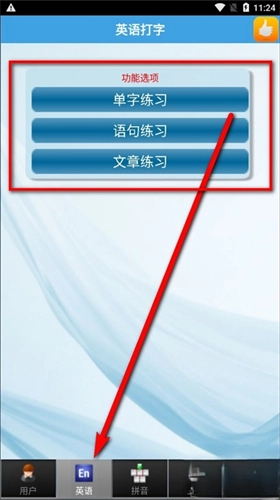 2、轻点屏幕下方的英语按键,就能进入英语打字练习界面,在此可进行单字、语句以及文章的练习。