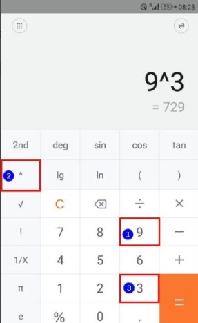 4、指数运算:点击 9 → ^ → 3 → 得出 729。