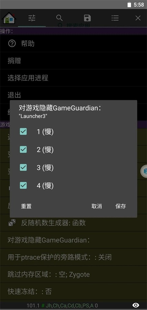 如上图,第一栏里最常用的便是内存范围选择、游戏变速、时间跳跃和对游戏隐藏以及过保护重启功能。
