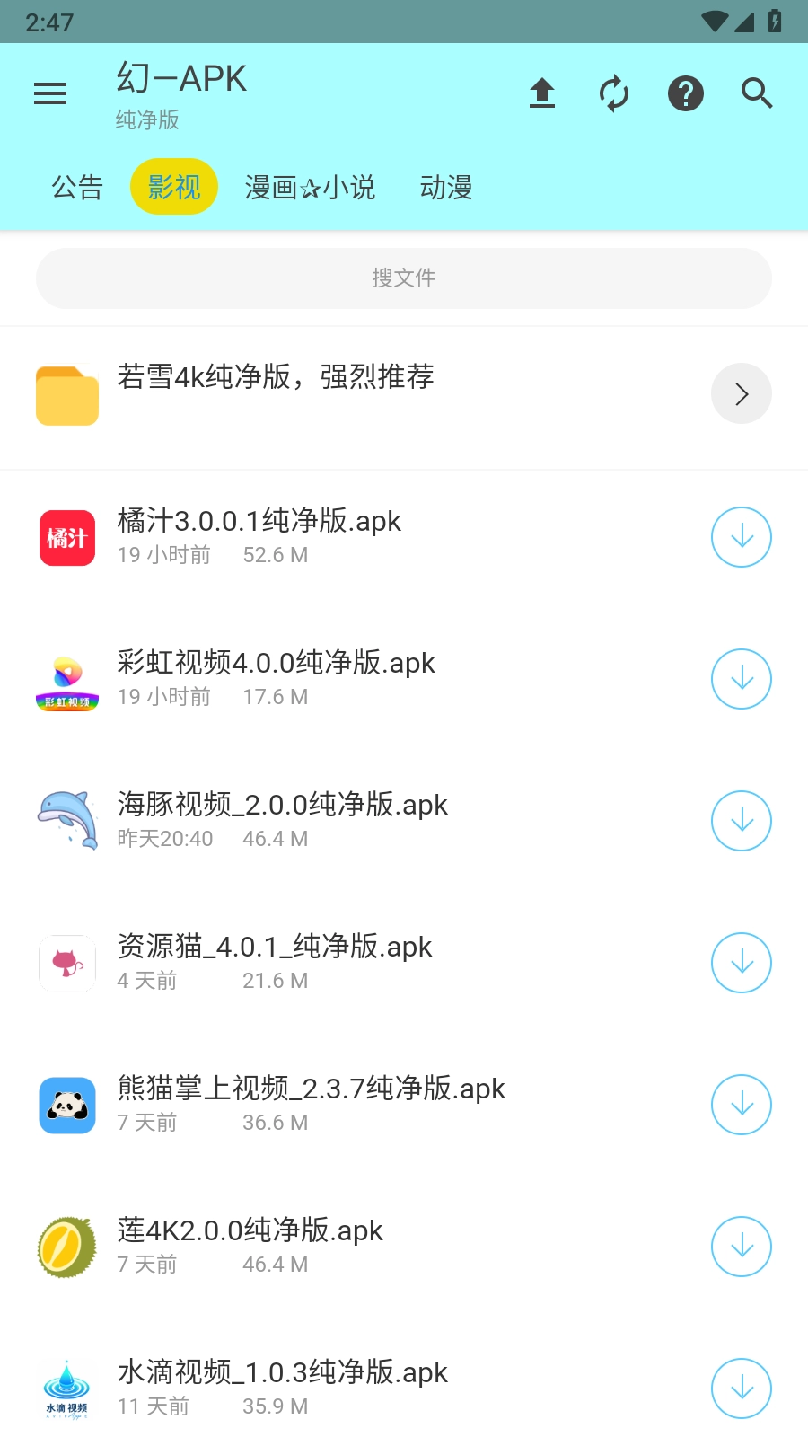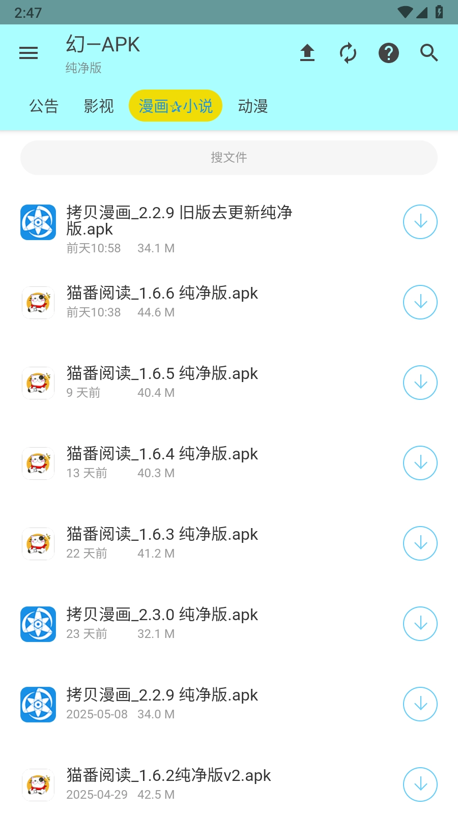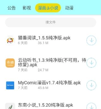 2. 依据需求,挑选影视、漫画、小说、动漫等不同类型的软件,点击即可直接下载。