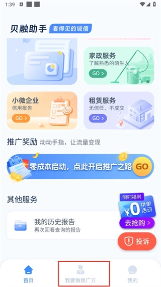 1、第一步,打开贝融助手软件,进入首页后切换至【我要做推广方】。