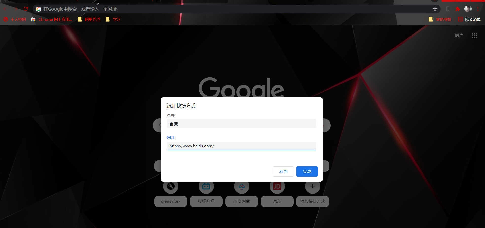 在谷歌页面设置快捷方式,将百度或者Bing的网址输入,下次点击快捷方式即可登录到百度或Bing主页(和法一有些雷同)