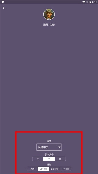 5、要是一开始进入时忘记选择语言,在此处同样能够选择,此外还能设置字体大小与通知时间。