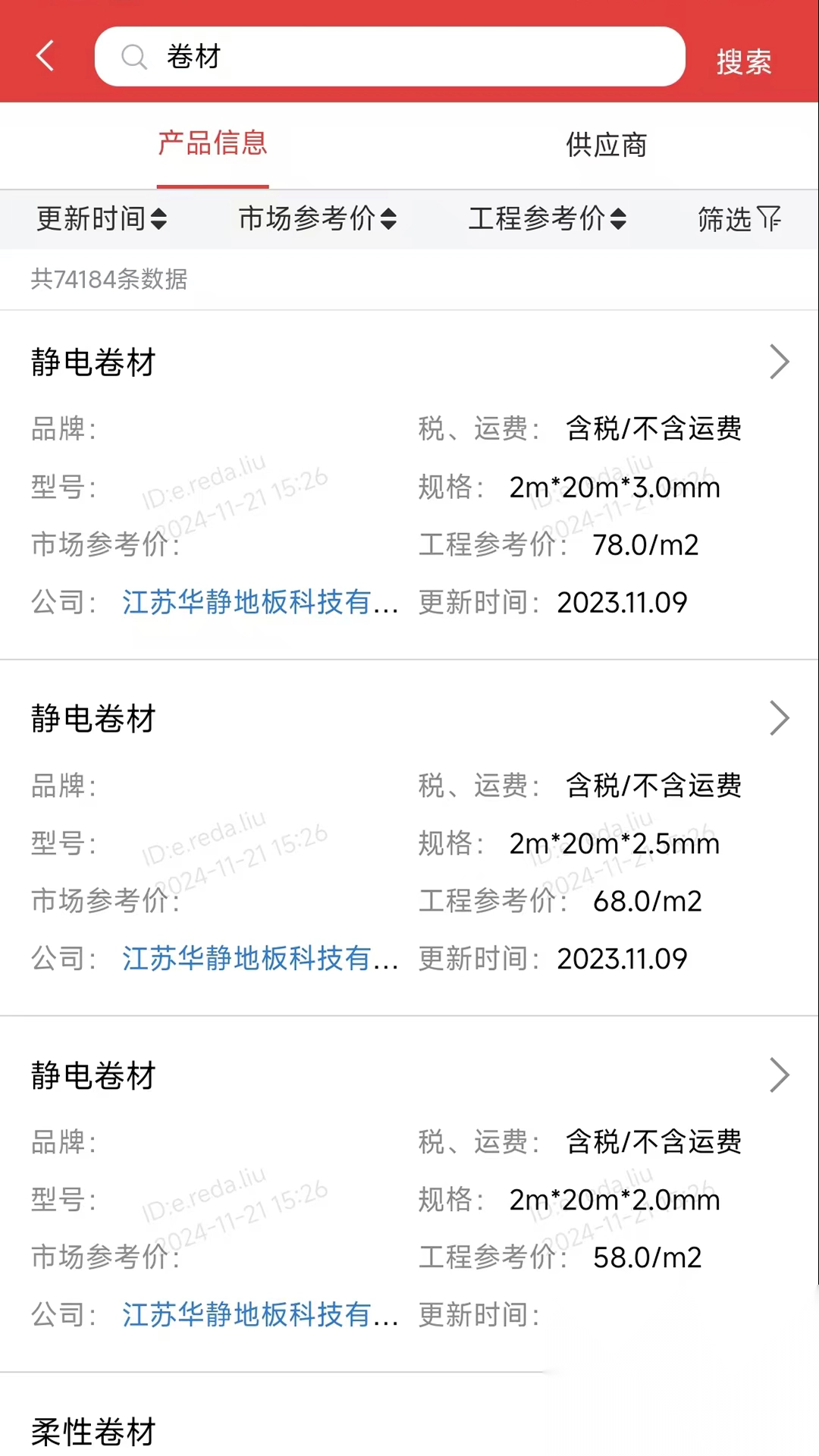 2、在搜素框输入你想要的建材相关名字,可以快速检索产品;