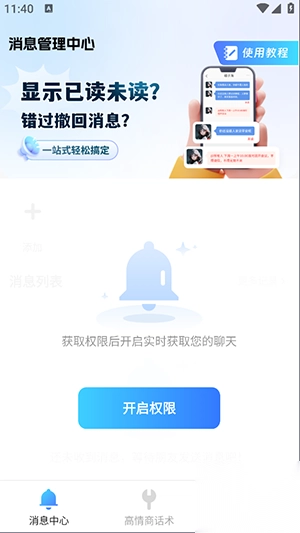 1、在首页点击回去权限,打开通知使用权后,将可以在我们APP查看所有‘已撤回’的信息。