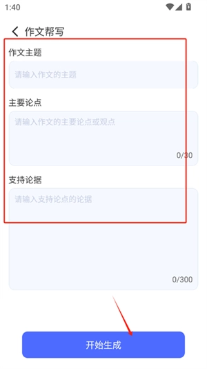 4、轻点“作文帮写”,填入作文主题、论点以及论据,随后点击“开始生成”就能完成操作。