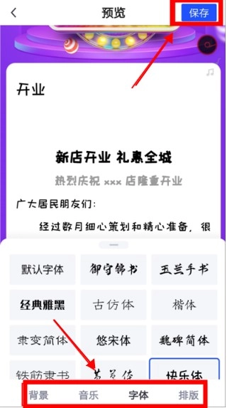 5. 在预览界面,你能够对海报的背景、音乐、字体样式与排版等各项设计元素加以调整,务必让每一个细节都达到预期效果。待所有修改完成后,点击“保存”按钮完成保存操作。