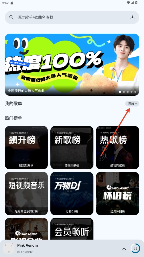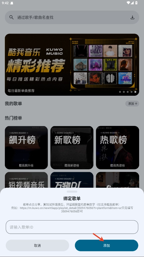 2.复制酷我歌单的id粘贴进框内点击添加即可