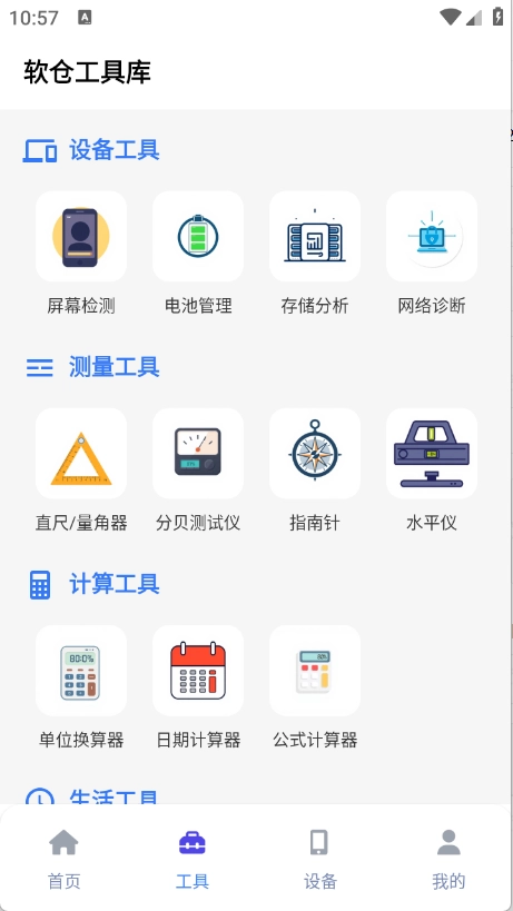 软仓工具库App,一款实用又免费的手机工具箱。这款App集合了设备工具、测量工具、计算工具、生活工具等众多工具类型,各类工具应有尽有,分类细致入微,查找起来十分便捷。重点是,所有工具统统免费使用,能一站式满足大家在生活、工作等方面的需求。有需要的朋友,欢迎下载体验。