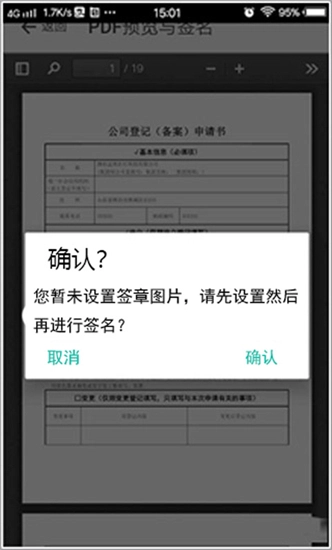 4、若您此前尚未设置签章图片,系统将自动给出提示,需先进行设置,之后方可签名。点击“确认”后,会自动跳转至签章图片设置界面,在此界面点击“确定”按钮,接着点击“设置手写签章”。