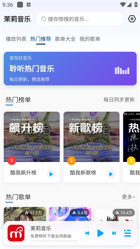 1. 打开茉莉音乐app,映入眼帘的便是首页,在此页面能够看到诸多热门推荐的歌曲。