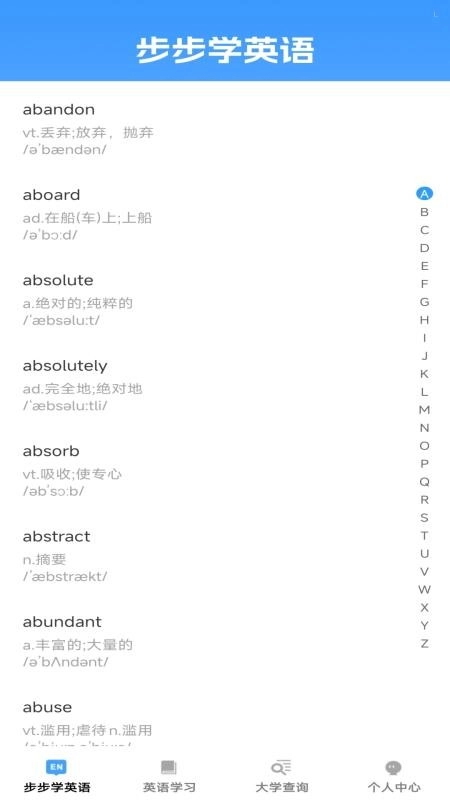 1、用户在软件里能够进入步步学英语页面,查看并学习各类英语单词。
