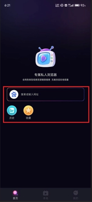 2、如图所示,首页极为简洁,仅有一个搜索框、历史记录以及收藏夹。