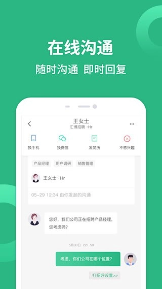 3、 能与企业HR在线畅快交流,沟通毫无阻碍,无需出门,就能轻松求职。