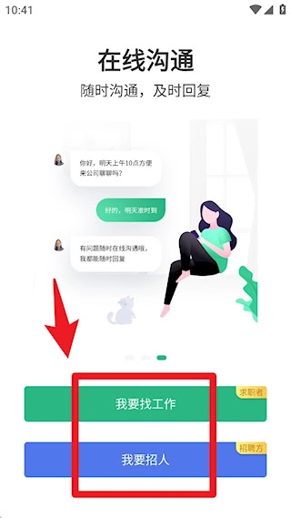 1. 开启该软件,随后点击“我要找工作”按钮或者“我要招人”按钮,根据自己的身份,选择与之对应的求职端或招聘端,进而进入平台首页。