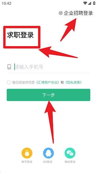 2、求职者在登录界面填写手机号码,点击“下一步”获取验证码即可完成登录操作,此外,还能切换至企业登录入口。