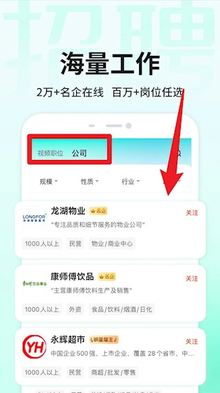 3、 来到首页后,点击底部的“公司”标签页,便能浏览众多入驻企业的资料及其发布的招聘岗位,还可对感兴趣的公司进行关注。