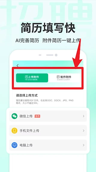 4、在简历上传页面,求职者有“上传附件”与“制作附件”这两种方式可供选择。此外,该软件还支持借助微信、手机、电脑等多种途径来导入文档。