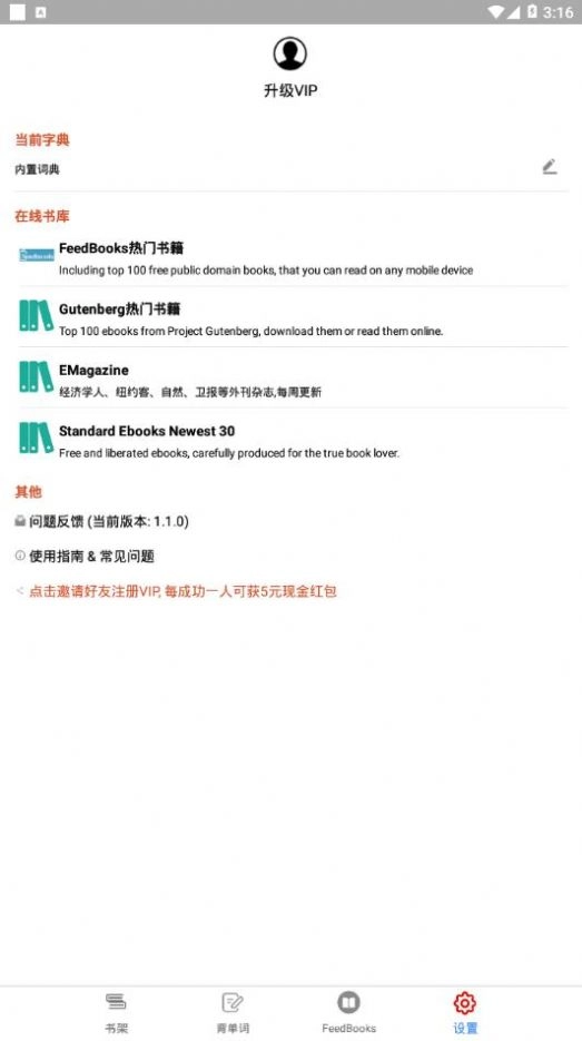 1. 海量在线阅读资源:涵盖FeedBooks百强热门书籍、古登堡百强热门书籍、英语外刊杂志(像《经济学人》《纽约客》等),还有《暮光之城》《哈利波特》等经典小说全本,十分适合深入研读。