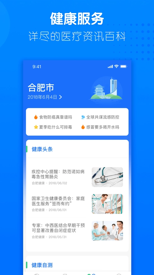 健康合肥是一款专业的手机医疗软件。它全面整合线上线下各类医疗资源,深入分析当下广大用户实际的医疗服务需求,进而为用户高效提供院前疾病预防、健康评估、健康咨询以及挂号服务。在院中,能实现手机缴费、候诊、导航、报告查看等功能,院后还提供随访、康复指导等服务,打造全方位的互联网医疗健康闭环。这种服务不仅为用户带来更便捷高效、省时省钱的就医方式,还为医生安全高效地行医与随访提供互联网支持。有需求的用户,快来体验吧!