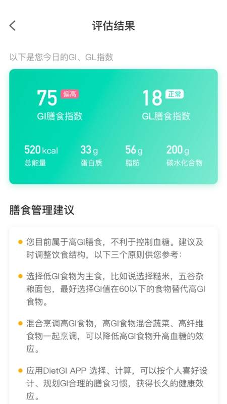 4. 血糖管理功能:精准计算每餐及每日膳食的升糖指数(GI),对已摄入食物的GI值进行评估,为糖尿病患者以及有预防需求的人群提供饮食方面的指导。
