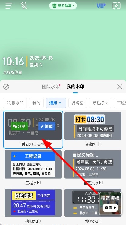 2、于水印选择界面,挑选时间地点天气类水印模板,随后进入此水印的编辑页面。