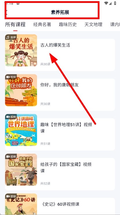 2、于素养拓展页面,点击“古人的爆笑生活”课程,随即进入该课程的详情页面。