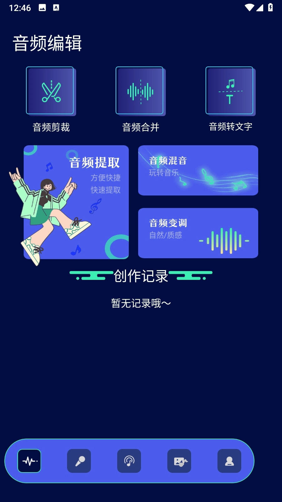 1、当在本站完成软件安装并打开后,能够看到软件具备音频提取、音频变调、音频混音等编辑功能。