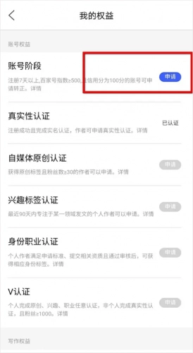 3、进入“我的权益”,选择账号阶段,点击申请。