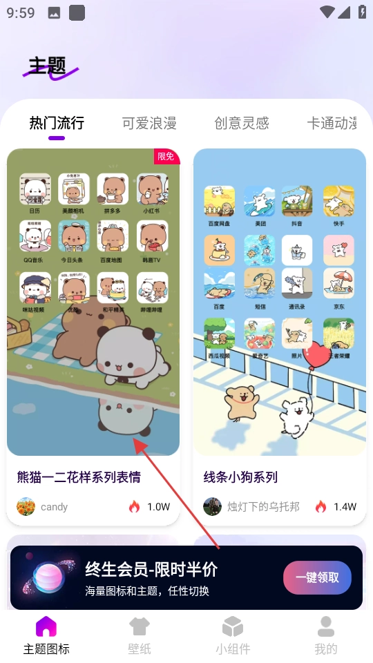 2. 挑选心仪的主题,例如熊猫一二花样系列表情,然后进入该主题的详情页面。