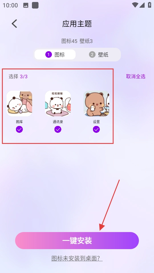 4、进入应用主题界面,挑选好打算应用的图标,接着点击一键安装,从而完成主题应用的相关操作。