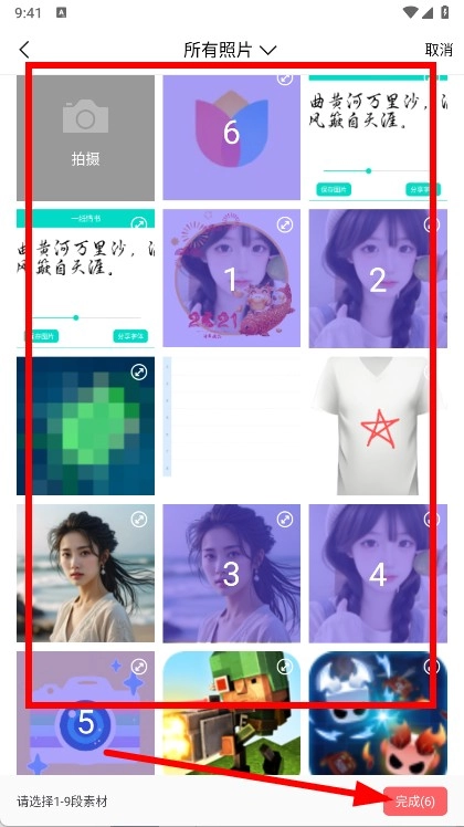 3、于照片选择页面,挑选素材照片后,点击“完成”按钮,随即进入模板拼图页面。