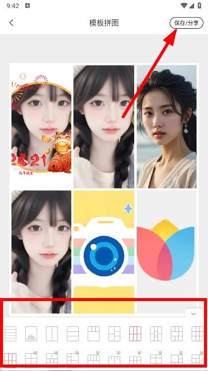 4、挑选适宜的拼图模板,对图片位置及大小加以调整,接着点击右上角的保存与分享按钮,从而完成拼长图的操作。