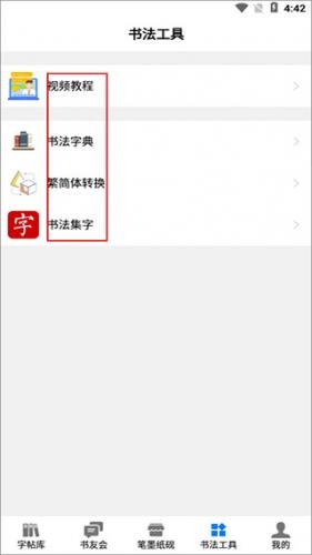 5、在软件的书法工具里,不仅能观看书法视频教程,还设有书法字典可供查询。