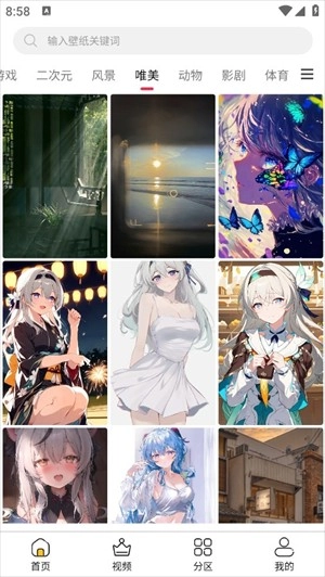 2、“视频”板块里,动态壁纸依据类别做了细致划分,无论是风景、二次元还是动漫等,都能在此找到。