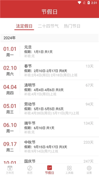 天数:你还能轻松得知未来节假日的具体日期,以及距离这些节假日的倒计时天数。